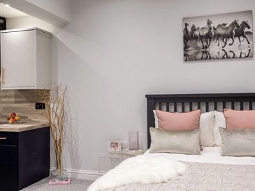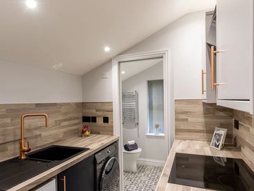 The newly finished kitchenette and bathroom, needed some help to breathe life into a stark space.